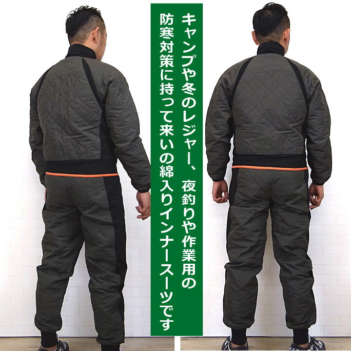 GE-2040インナーツナギ(長袖)サイズスペック※※注意!(小さめの作りです!必ず1サイズ大き目を選んでください!!) SS(参考身長156-161)バスト99裄丈76着丈47W90股下70S(参考身長161-166)バスト103裄丈79着丈49W94股下72M(参考身長166-171)バスト107裄丈82着丈51W98股下74L(参考身長171-176)バスト111裄丈85着丈53W102股下76LL(参考身長176-181)バスト115裄丈88着丈55W106股下783L(参考身長181-186)バスト119裄丈91着丈57W110股下804L(参考身長186-191)バスト123裄丈92着丈59W114股下805L(参考身長191-196)バスト127裄丈93着丈61W118股下806L(参考身長196-201)バスト131裄丈94着丈63W122股下80 ■素材:ポリエステル100% ■中綿:ポリエステル100%(※サーモライト) ■裏地:ポリエステル100% ■商品説明※※注意!(小さめの作りです!必ず1サイズ大き目を選んでください!!) インナーツナギ?(インナースーツ)なんて超昔しから有る商品だよ〜 な〜んて言ってるアナタ!確かに!ありましたよね〜 でも、今回は昨年を上回り!さらにかっこ良くなって新登場! 中綿は前回通りサーモライトを使ってるんで保温性もバッチリ! デザインはシンプル、カラーはトレンドのカモフラとブラック。