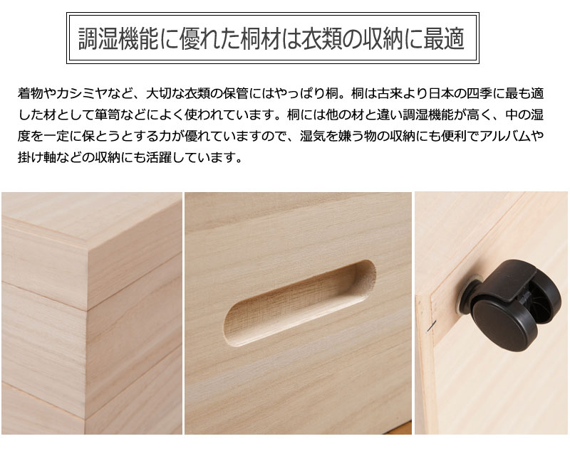 モダンな桐衣装箱 4段 高さ46cm(キャスター付き)取っ手金物のないシンプルに仕上げたモダンな印象の桐衣装箱。