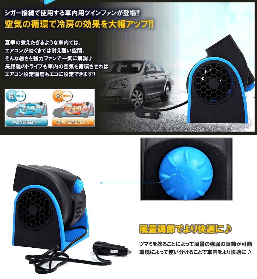 シガー接続で使用する車内用ツインファンが登場!! 空気の循環で冷房の効果を大幅アップ!! 夏季の煮えたぎるような車内では、 エアコンが効くまでは耐え難い空間。